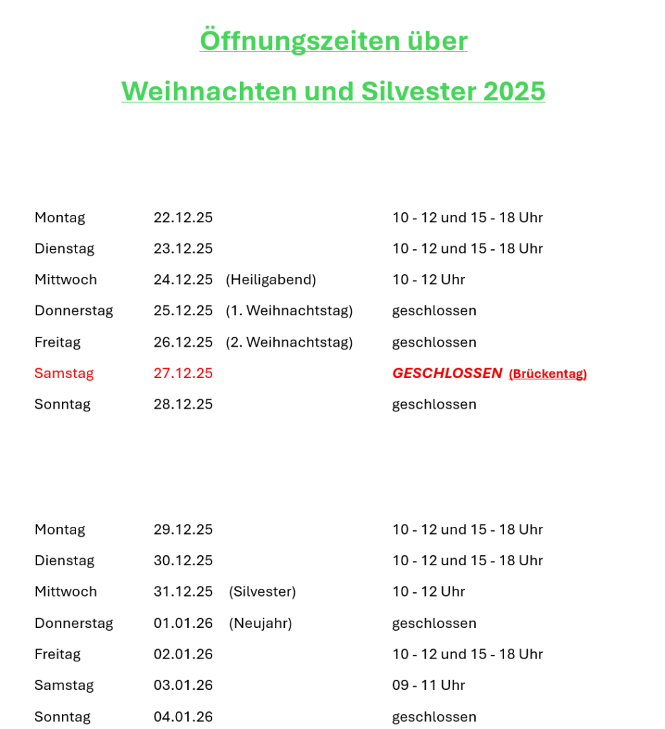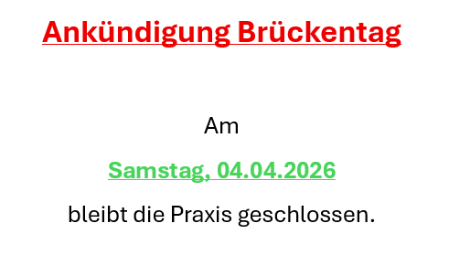 Die Sprechzeit am Samstag von 9.00 – 11.00 Uhr ist vorrangig für notwendige Nachbehandlungen und Notfälle vorgesehen.